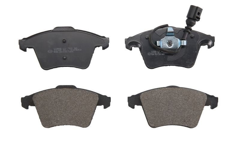 Brake pads set front (with extras; with integrated wear sensor), fits: VW MULTIVAN T5, MULTIVAN T6, TRANSPORTER T4, TRANSPORTER T5, TRANSPORTER T6, TRANSPORTER T6 / CARAVELLE T6 1.9D-3.2 10.92-