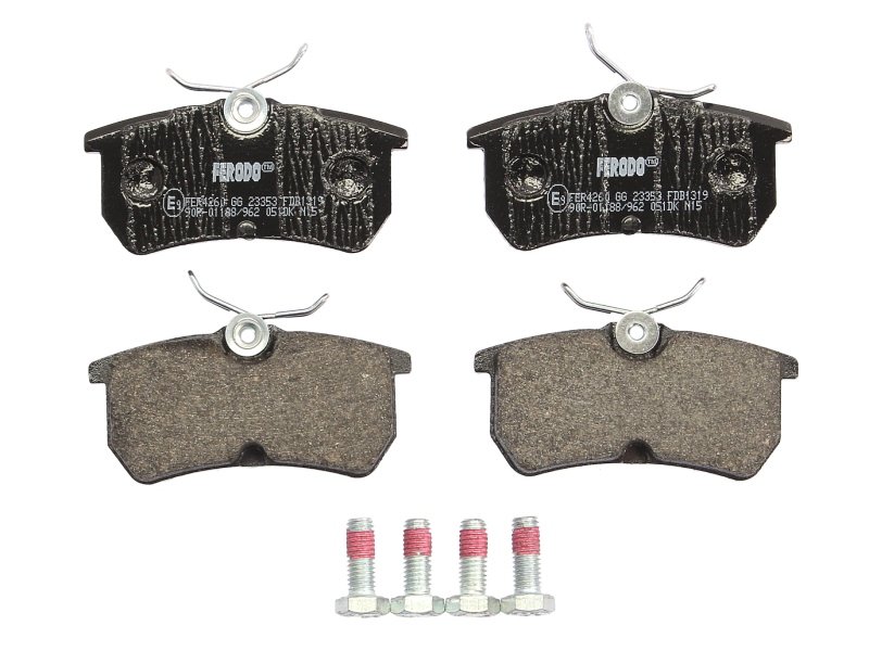 Brake pads set rear (with brake caliper guide bolts), fits: FORD FIESTA V, FIESTA VI, FOCUS I, FOCUS I/KOMBI, PUMA; FORD USA FOCUS, FOCUS ZX3, FOCUS ZX5 1.0-2.0 08.98-